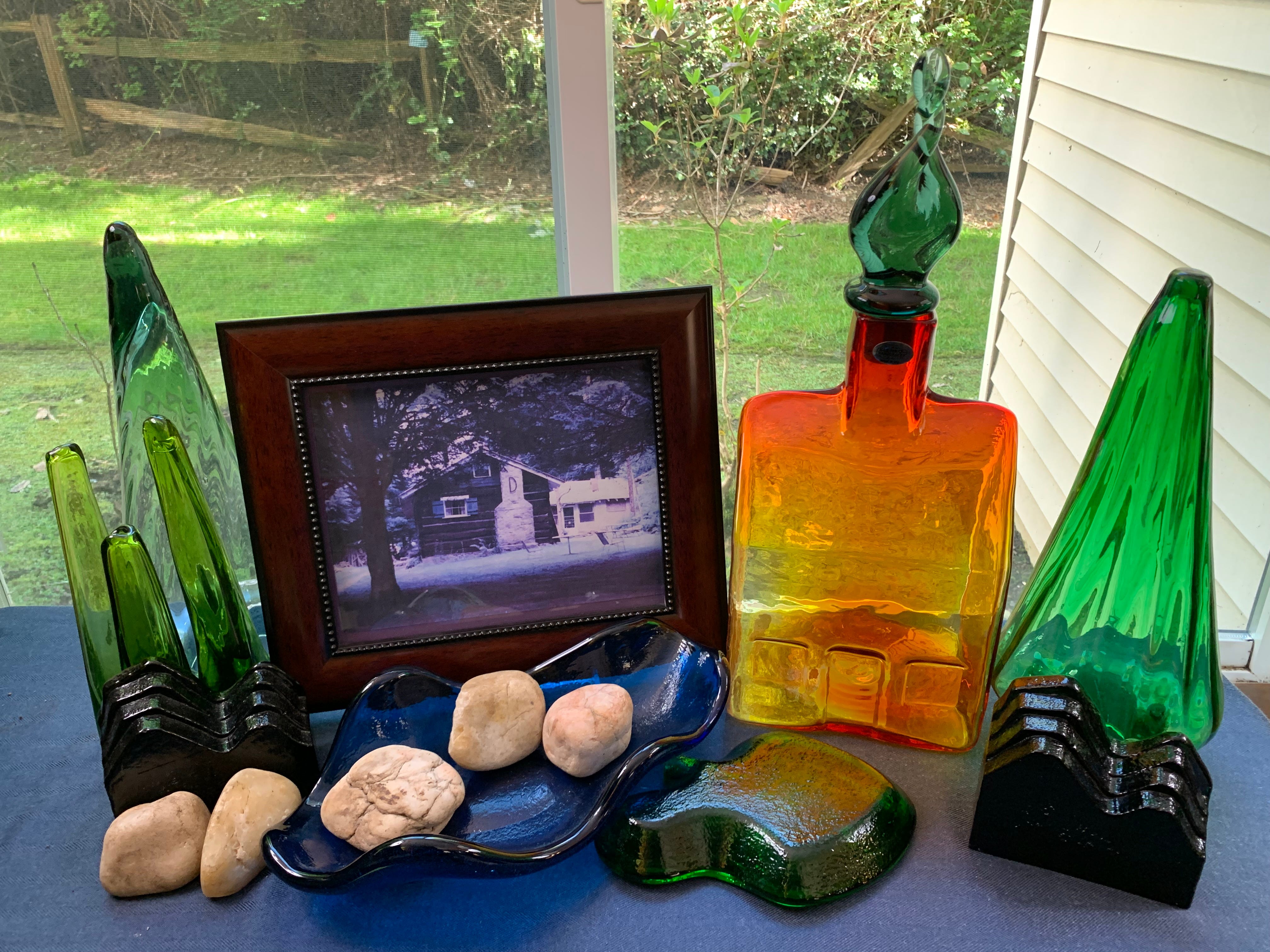Each year, Blenko Glass produces a unique limited-edition design for the June 20th birthday of West Virginia, and last year, Blenko Glass produced a large tangerine glass cabin designed by Kelsey Murphy for the 2022 West Virginia Birthday Piece. While the Blenko cabin was not a replica of the family cabin I knew, for me it is a beautiful representation that evokes my family cabin memories. Displayed in this photo is my framed picture of the Deerfield cabin along with Blenko glass pieces representing the cabin, trees, hills, and creek. The stones in and along my representative “creek” are ones my grandmother collected from her original home along Twelvepole.